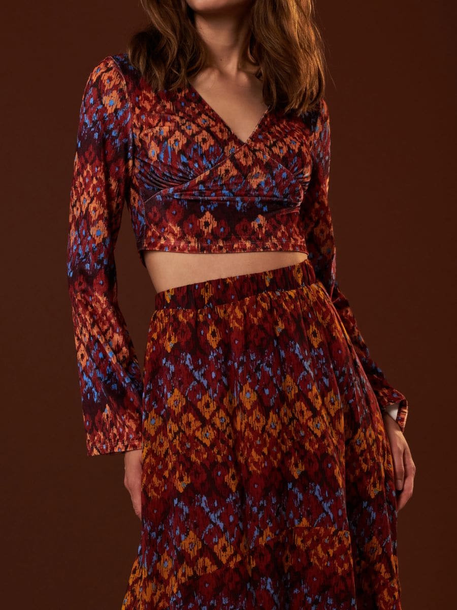 Vzorčasta kratka bluzka crop top z dolgimi rokavi