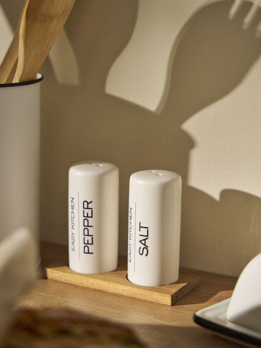 Керамічні сільничка та перечниця на дерев’яній підставці