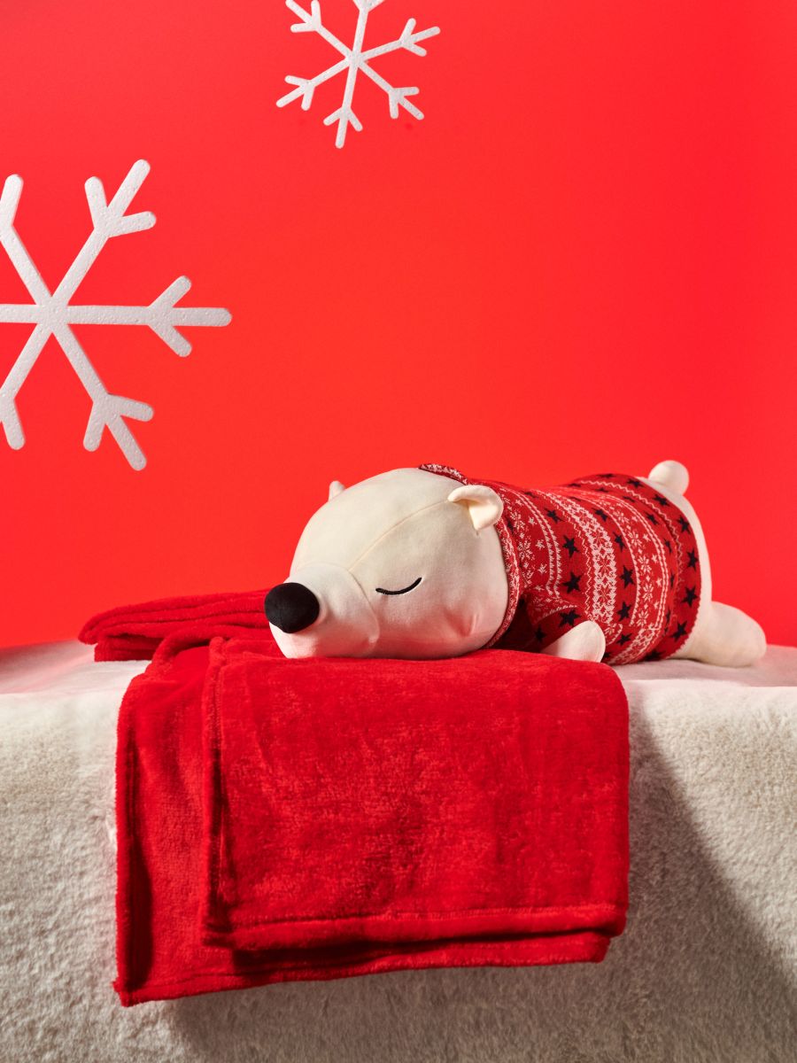 Плюшевий білий ведмідь із пледом, схованим у кишені на блискавці