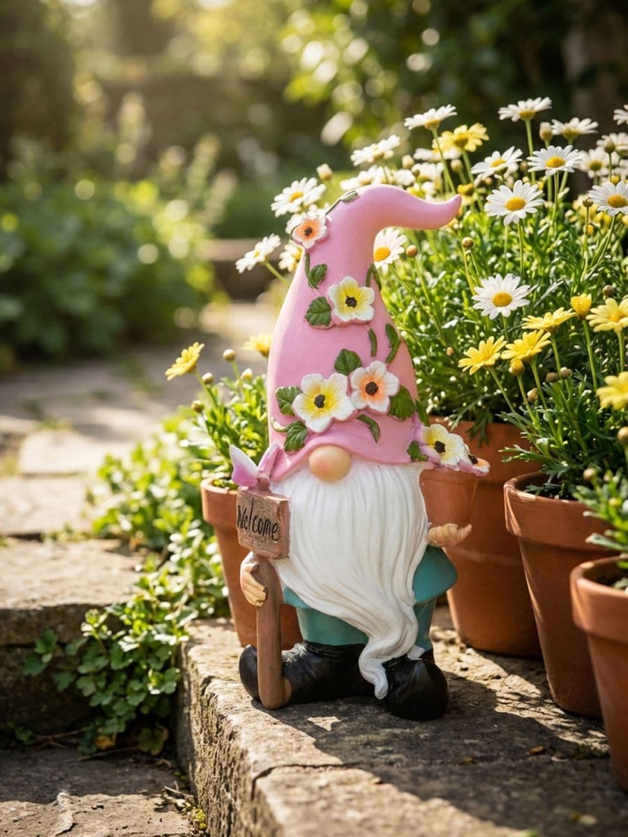 Садова декорація у формі гнома з табличкою та горщиком