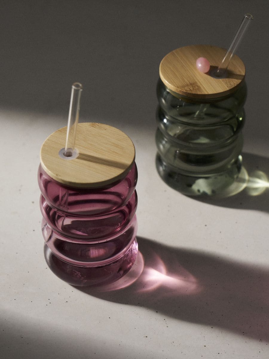 Скляний кухоль з кришкою та соломинкою