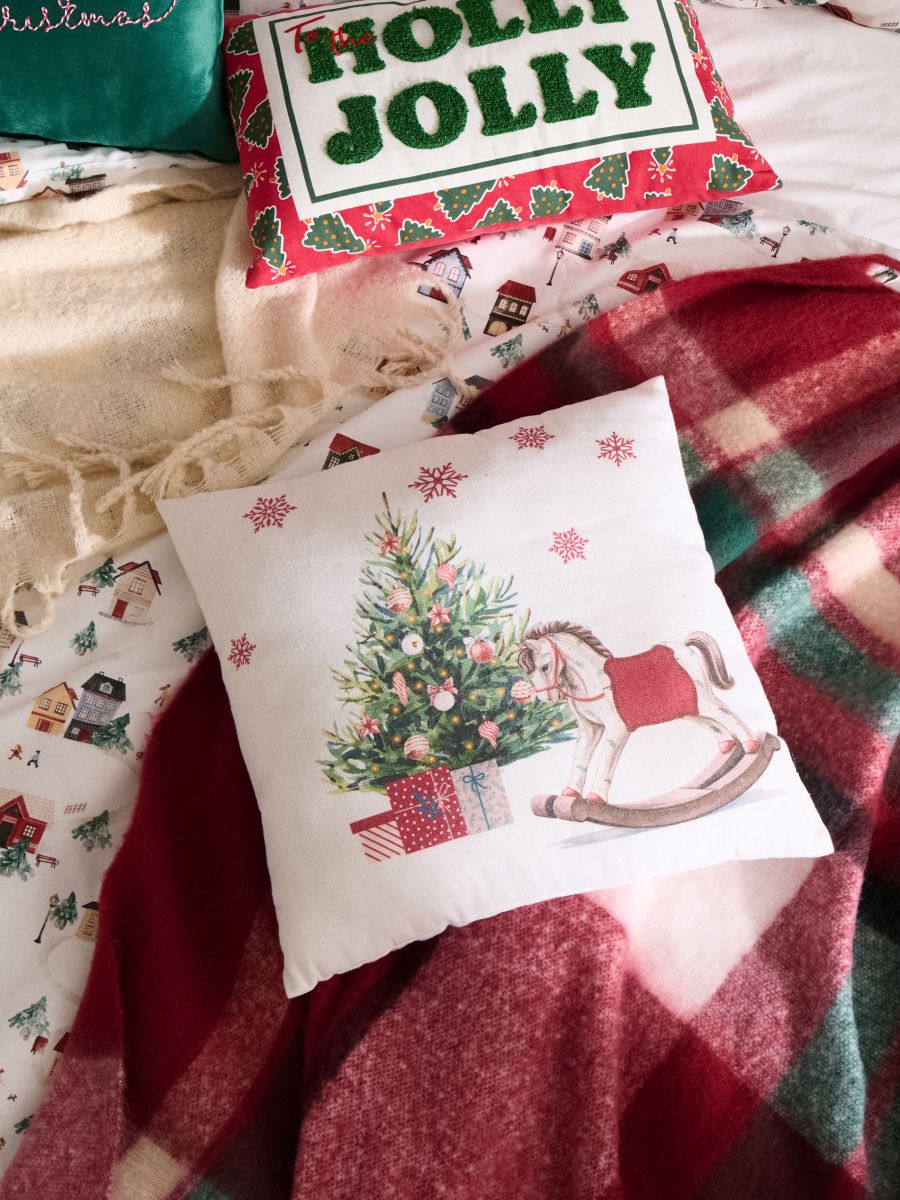 Святкова декоративна подушка з мотивом ялинки та коника-гойдалки
