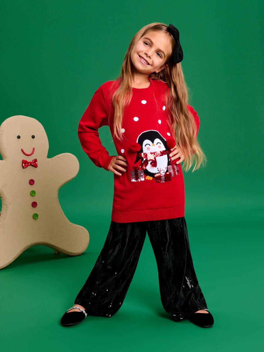 Святковий светр із пінгвіном, оздобленим паєтками та помпонами