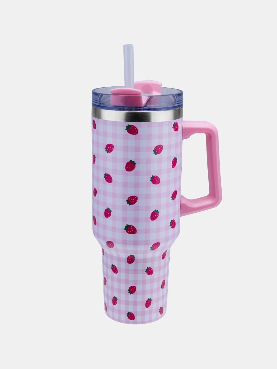 Термокружка з ручкою та соломинкою з мотивом полуниць